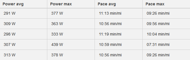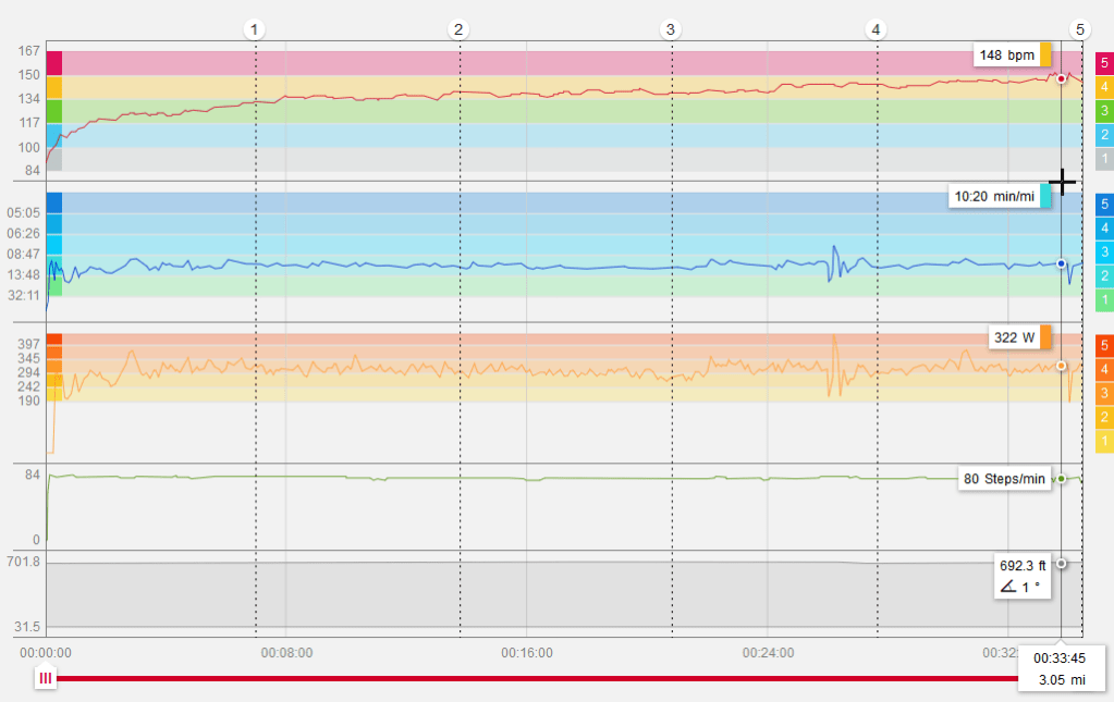 Likely because of the kilogram-laden paunch I’m generating between 439W and 333W. I don’t know why it fluctuates by 25% especially since my cadence remains between 79 and 84 steps per minute – which seems relatively consistent.
